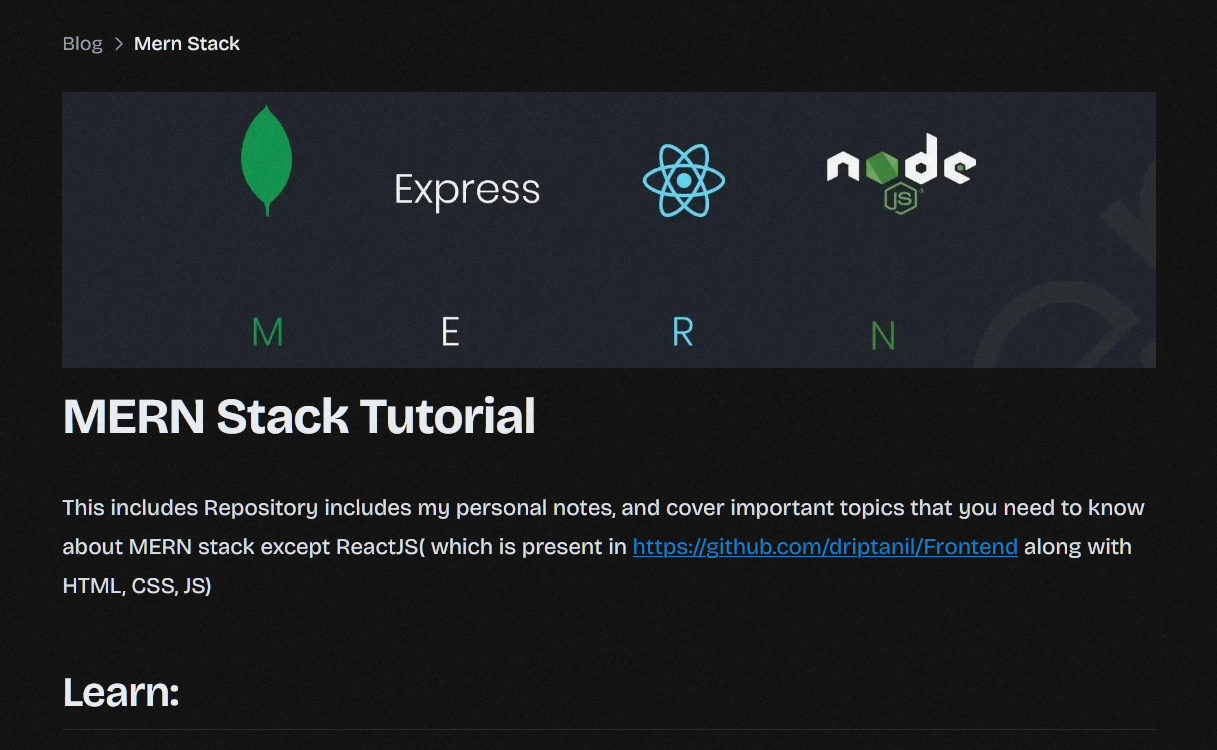 This includes Repository includes my personal notes, and cover important topics that you need to know about MERN stack except ReactJS( which is present in https://github.com/driptanil/Frontend (opens in a new tab) along with HTML, CSS, JS)