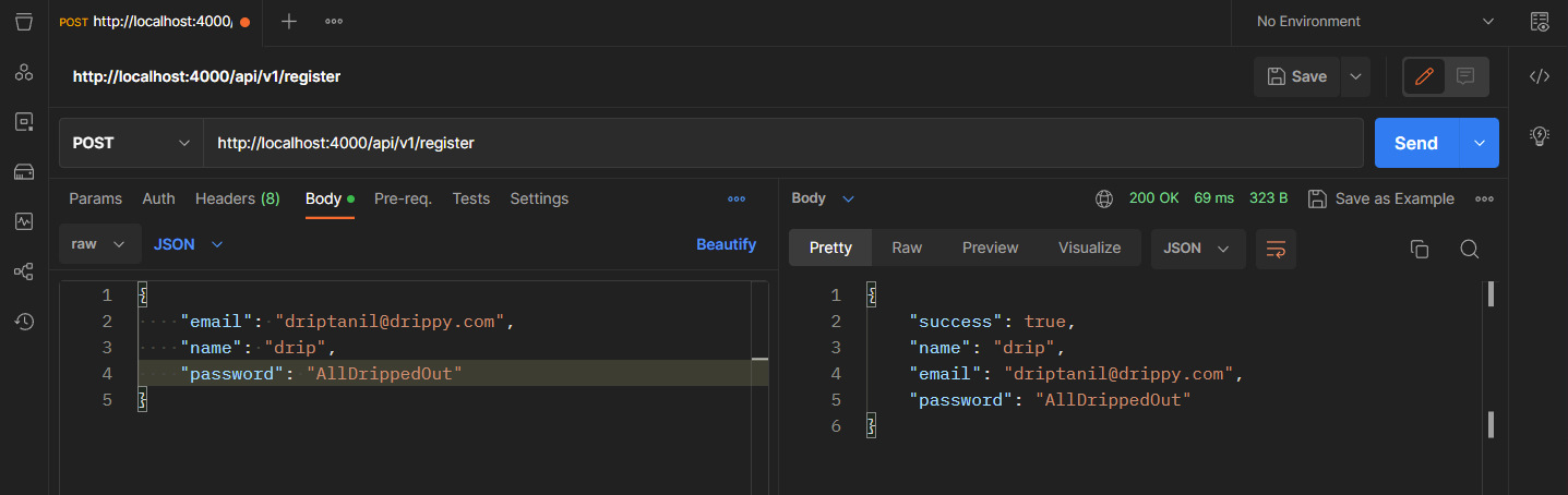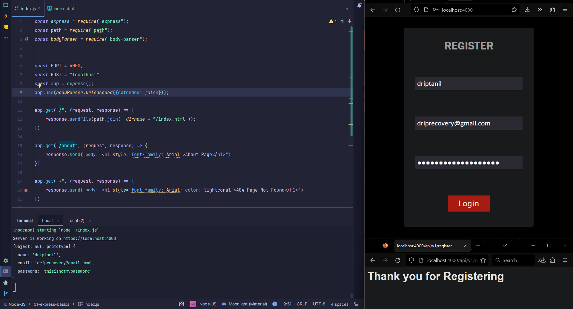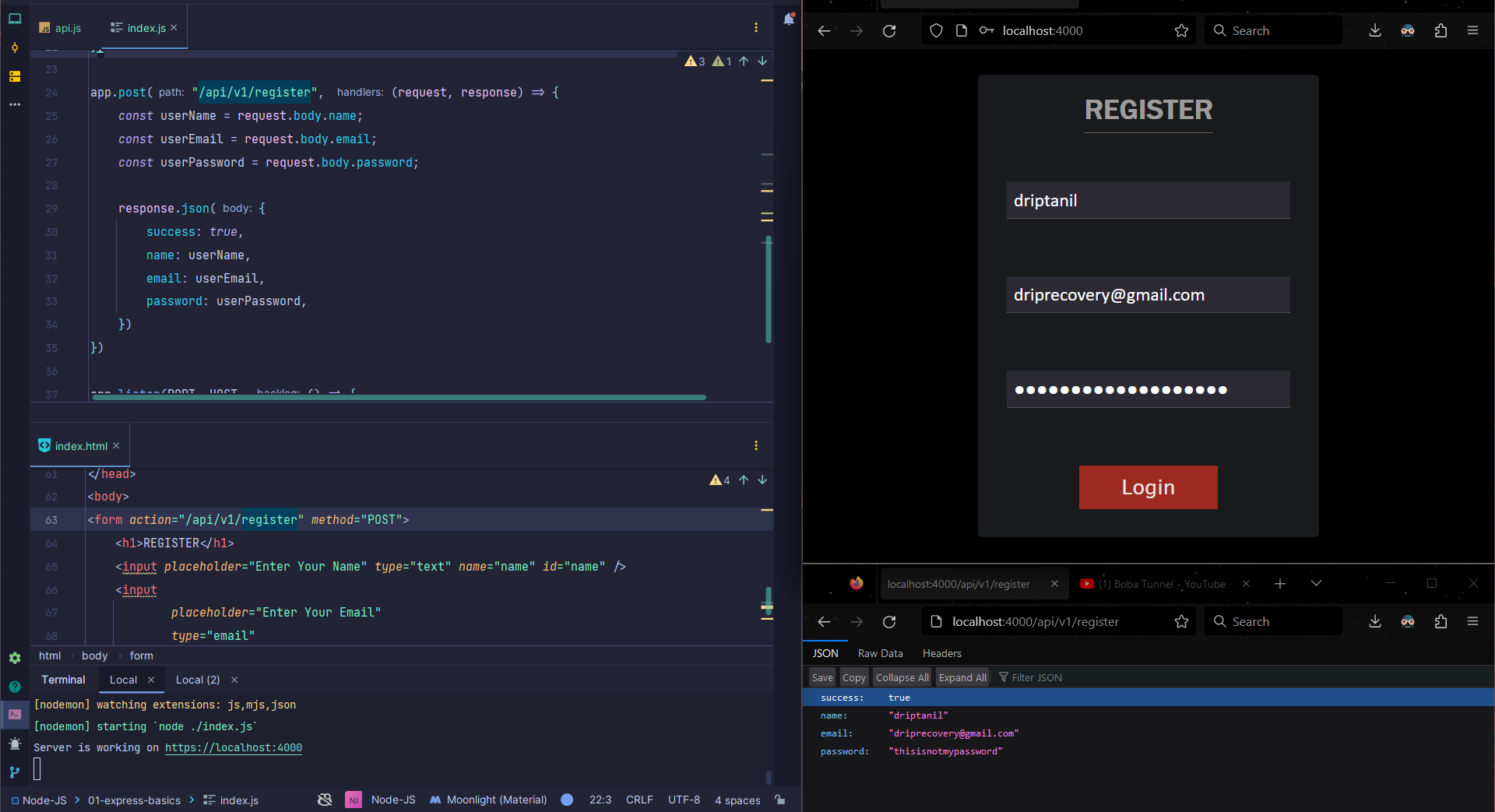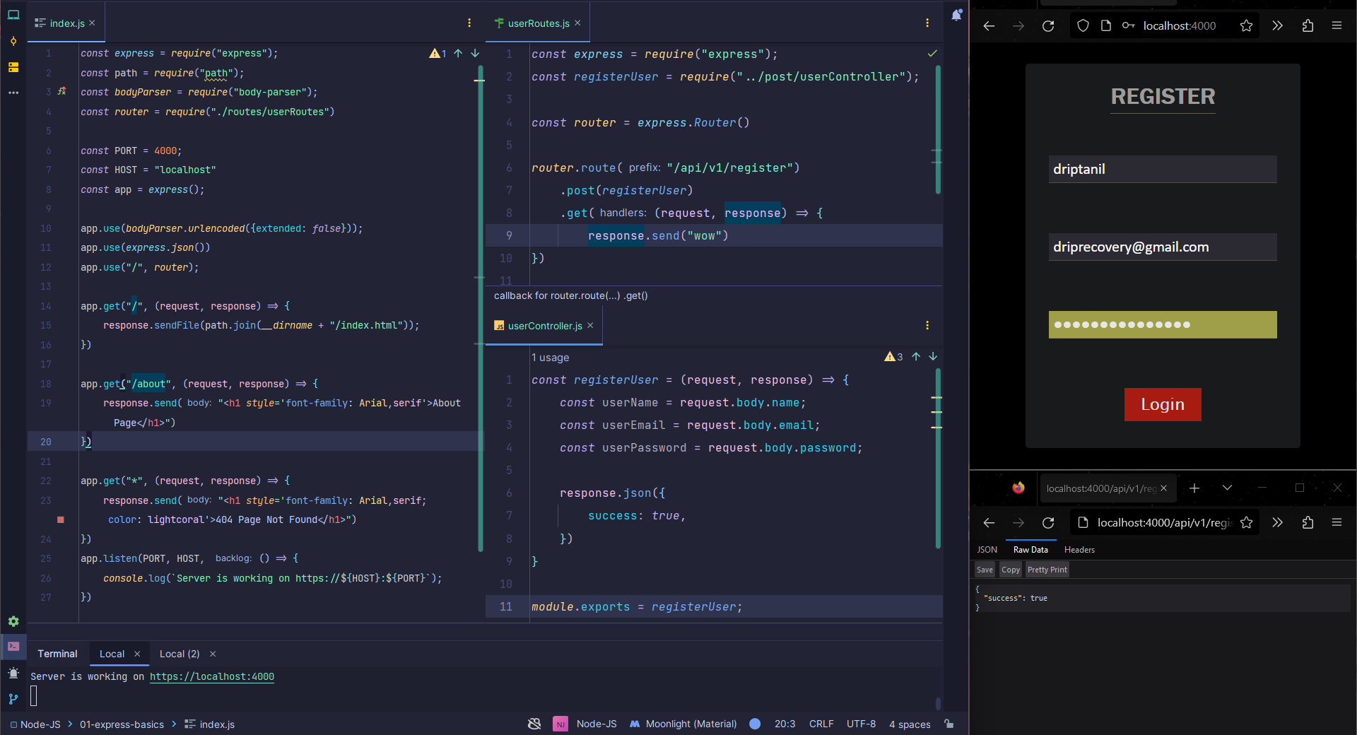 app.use(express.json())toapi.js,const express = require("express"); const bodyParser = require("body-parser"); const { response } = require("express"); const PORT = 4000; const HOST = "localhost"; const app = express(); app.use(bodyParser.urlencoded({ extended: false })); app.use(express.json()); app.get("/api/v1/userdata", (request, response) => { response.json({ name: "driptanil", email: "driprecovery@gmail.com", password: "thisisnotmypassword", }); }); app.get("*", (request, response) => { response.send( "<h1 style='font-family: Arial; color: lightcoral'>404 Page Not Found</h1>" ); }); app.post("/api/v1/register", (request, response) => { const userName = request.body.name; const userEmail = request.body.email; const userPassword = request.body.password; response.json({ success: true, name: userName, email: userEmail, password: userPassword, }); }); app.listen(PORT, HOST, () => { console.log(`Server is working on https://${HOST}:${PORT}`); });