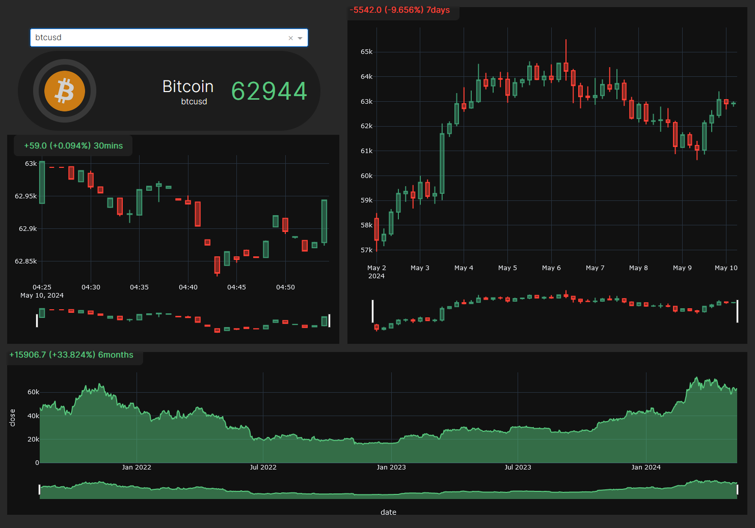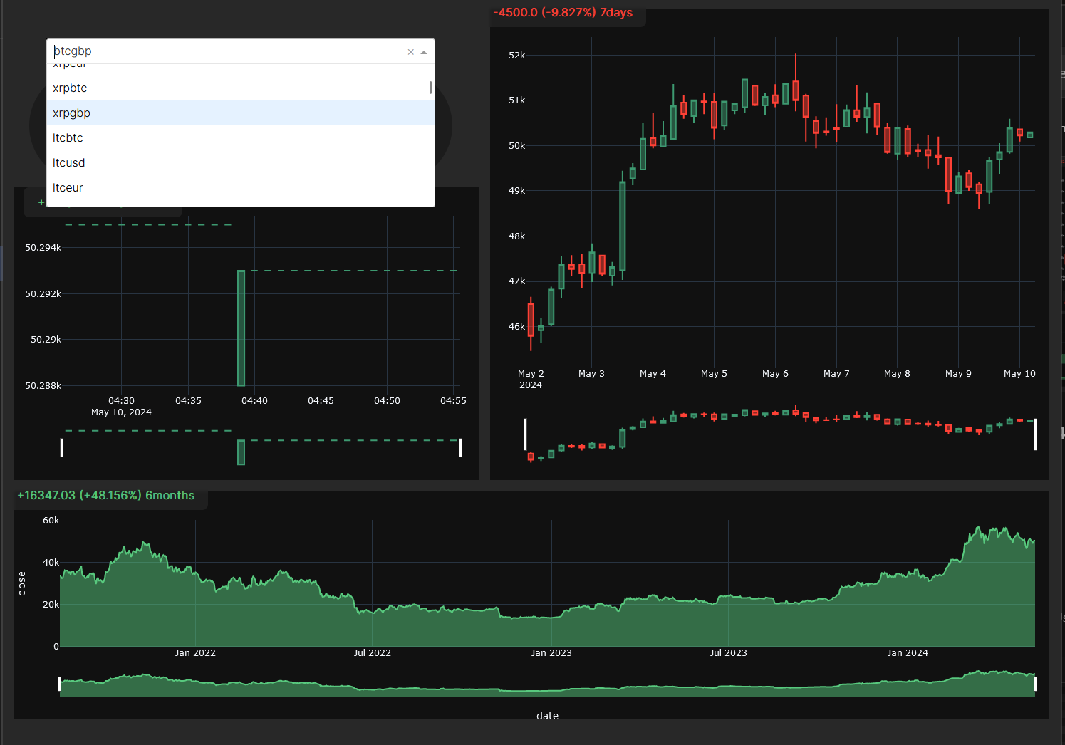 Real-time market data, Percentage of Profit / Loss of 30 mins, 7 and 6 months, Candle Stick Graph for short term Line Graph for long term